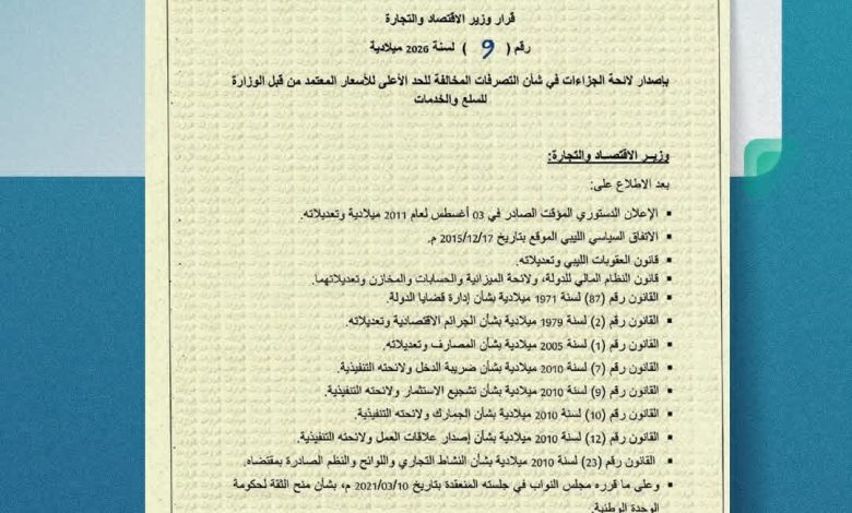 أصدر وزير الاقتصاد والتجارة، القرار رقم 9 لسنة 2026، بشأن اعتماد لائحة الجزاءات في مواجهة التصرفات المخالفة للحد الأعلى لأسعار السلع والخدمات.