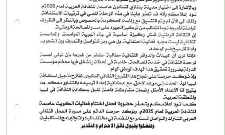 الخطاب لا يتضمن اعتراضًا على اختيار بنغازي، بل يوضح طلب تأجيل التنفيذ لأسباب إدارية وظرفية، وذلك وفق ما ورد في المراسلة الموقعة منها.